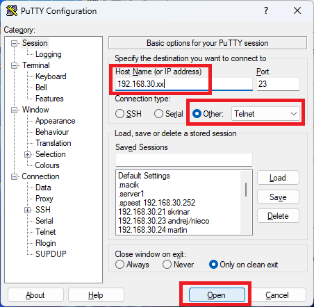 Pre pripojenie sa službou telnet spustite program putty znova a nastavte si ho podľa obrázka