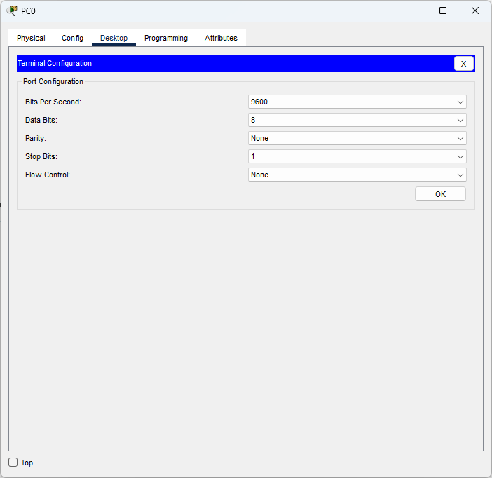 Teda komunikačná rýchlosť je 9600 bitov za sekundu, počet datových bitov je 8, bez parity, jeden stop bit a žiadne riadenie toku dát.