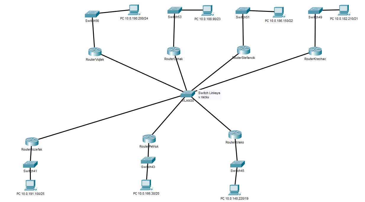 Vytvorte si sieť podľa topológie na obrázku. Nastavte sieťové prvky (router, switch). Natavte predlad adries z vašej siete