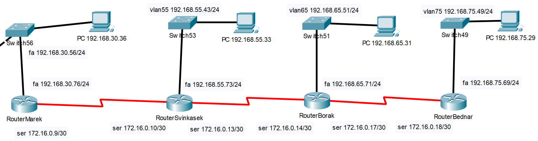 13. Nastavte statické smerovanie do všetkých sietí, ktoré sú vo vašom sieťovom segmente dostupné. Informácie ako na to môžete získať opäť v Cisco kurze Podstatné je určiť ktoré siete je potrebné pridať do smerovacej tabuľky. Aké je číslo siete (u sietí s netmaskou /30 to nebude na konci nula, ale treba to správne určiť). A tiež určiť cez akú adresu sa do tejto siete dá dostať (next hop).