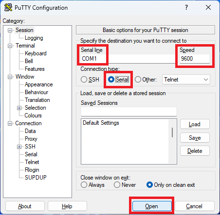 To prepne putty do režimu kedy pre komunikáciu používa sériový port počítača. Nastavte sériový port COM1