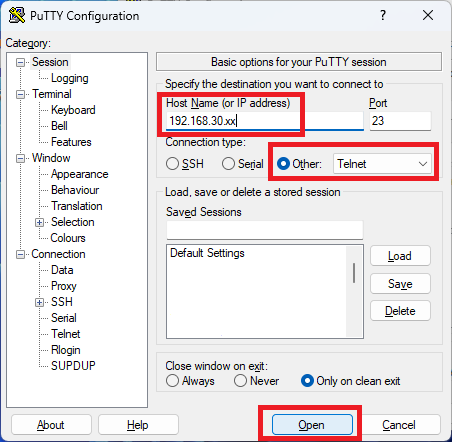 Pre pripojenie sa službou telnet spustite program putty znova a nastavte si ho podľa obrázka