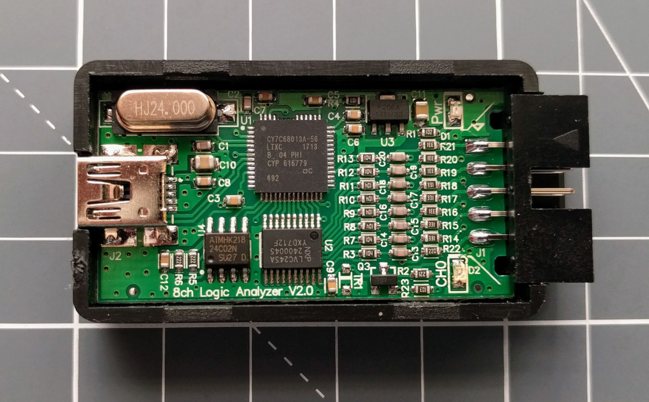 Saleae logic analyzator. Chybná krabička hovorí že VID = 04B4, PID = 8613. Google na toto hovorí že je to Cypress FX2LP No EEPROM Device.